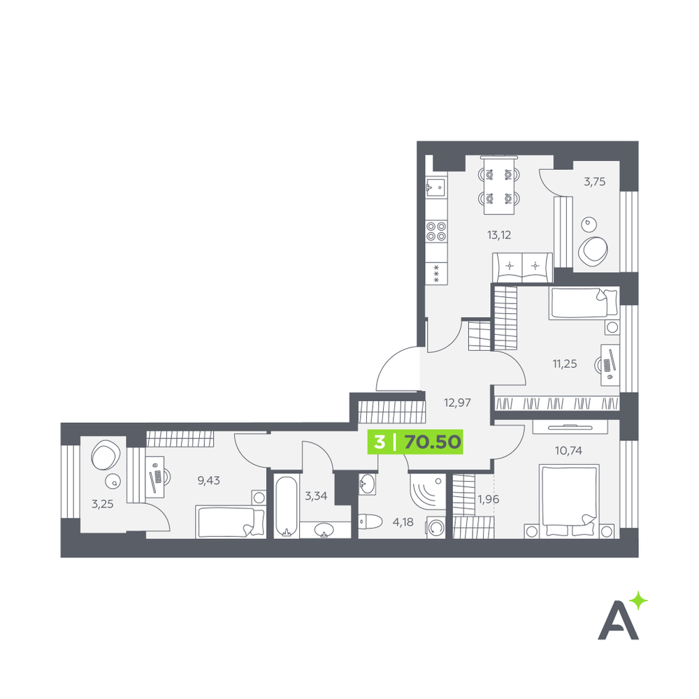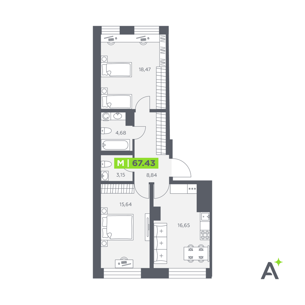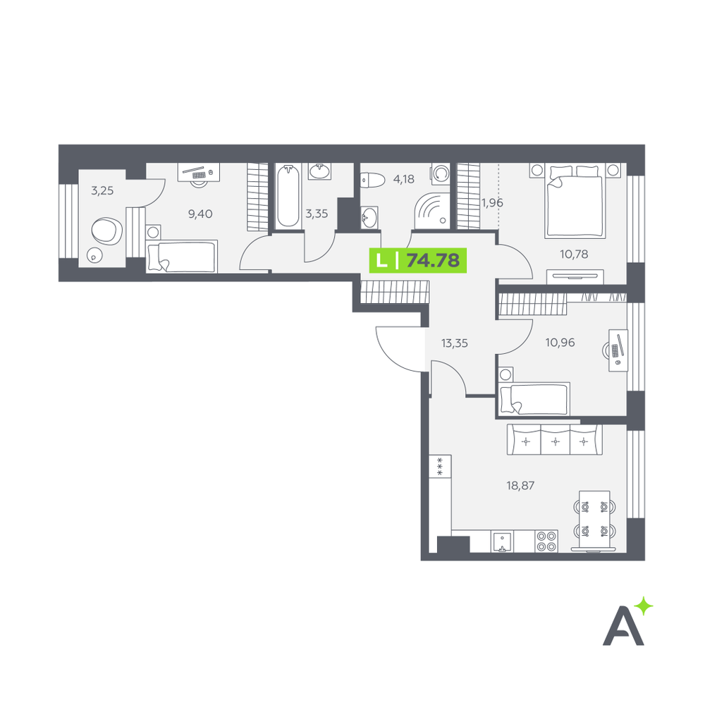 3-комнатная  74.48 м2